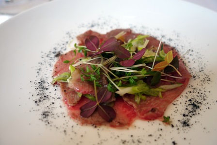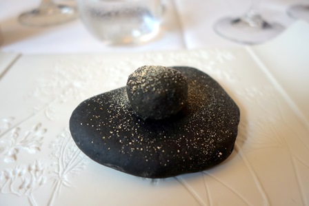Le menu est : chips / pain soufflé crème de carotte / bonite / bœuf Ozaki cru / Saint-Jacques, céleri rave, truffes noires / cromesquis de foie gras sur le bincho, potiron, truffes noires / rouget, cébette au cédrat, choux / agneau de pré salé, jus d’agneau, hélianthi, truffes noires / bœufs de maturation : normande 40 jours, Galice 60 jours, bœuf Ozaki poêlé sur la fonte et sur le bincho / agrumes / madeleines et truffes au chocolat et café.