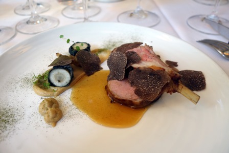 J’ai fait changer la recette de l’agneau, prévu au menu pour être terre et mer, en ne gardant que le côté terre. Cela convient au Château Pichon Longueville Comtesse de Lalande Pauillac 1993. Je voulais vérifier comment se comporte cette année annoncée petite et tout montre qu’elle a tout d’une grande. Le vin est élégant, avec de beaux tannins, agile et noble. C’est manifestement un grand vin, de grande finesse et de précision.