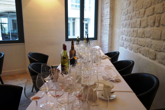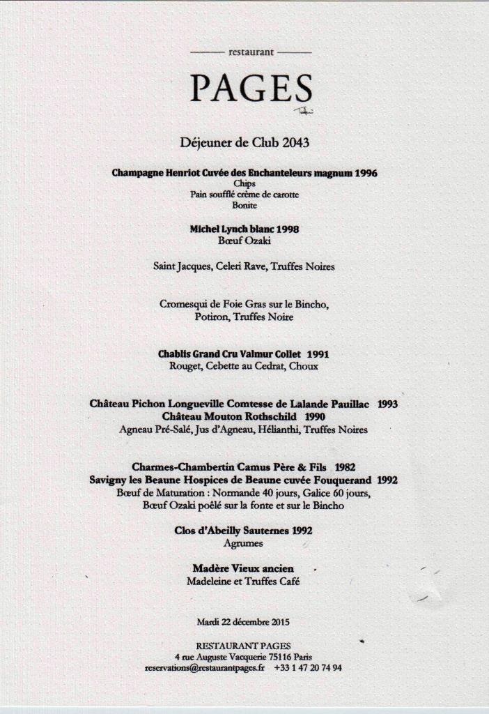 C’est à mon tour d’inviter mes amis conscrits. Nous déjeunerons au restaurant Pages où j’apporte mes vins à 9h45 pour les ouvrir, car l’ouverture précoce est une condition du succès de la présentation des vins au moment du repas. Je croyais que le chef serait présent mais on m’a prévenu la veille qu’il était parti pour le Japon. C’est dommage car j’aurais aimé que mes amis fassent sa connaissance.
