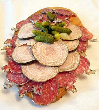 C’est le dernier déjeuner de l’année avec mes amis conscrits, au siège du Yacht Club de France. L’apéritif est copieux, avec des cochonnailles de grande qualité et des rillettes de la Belle-Îloise. Il y a une ‘Thoïonade’, mousse de thon aux olives et câpres, une ‘sardinade’ aux deux olives, des rillettes de lieu au poivre de Sichuan, des rillettes de maquereau au citron vert et une mousse de homard au cognac. Tout cela est délicieux et je préfère la sardinade suivie des rillettes de maquereau, le homard en mousse étant le moins excitant. Le Champagne Delamotte Blanc de Blancs sans année d’une première bouteille me semble avoir un léger défaut. La deuxième est beaucoup plus joyeuse, vive et pimpante, champagne à l’aise sur toutes ces saveurs marines. Une troisième bouteille me semble encore meilleure et je m’en réjouis. On me dit qu’il s’agit du Champagne Delamotte Blanc de Blancs Millésimé 2007. Il est brillant.