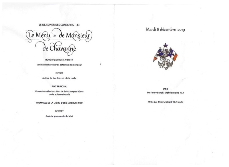 Le menu mis au point par le directeur Thierry Le Luc avec le chef Benoît Fleury est : autour du foie gras et de la truffe / velouté de céleri aux noix de Saint-Jacques rôties, truffe et fenouil confit / fromages de la Loire d’Éric Lefebvre / assiette gourmande de Mini.