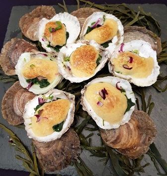 Les amuse-bouche sont toujours copieux et délicieux car Thierry a la passion des bons produits et les trouve : petites aumônières au saumon et Saint-Jacques / magret de canard fumé au bois de hêtre, gésiers de canard confits aux cèpes / huîtres plates Prat-Ar-Coum de Carantec nature ou gratinées.