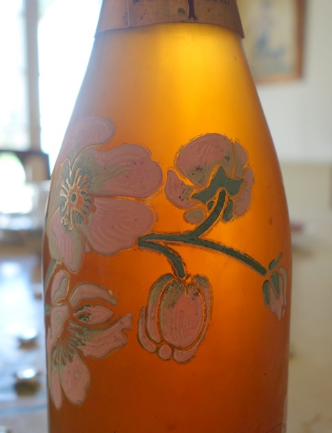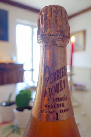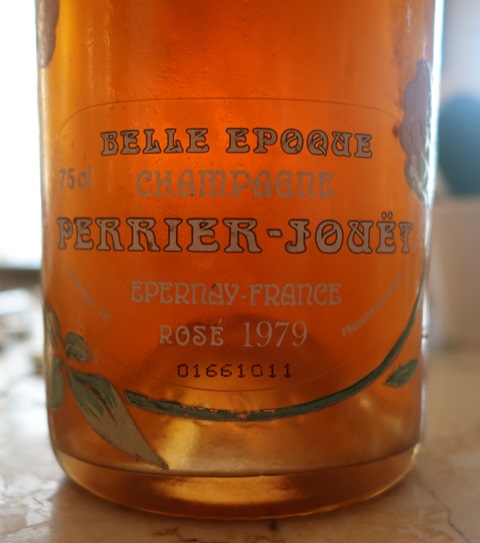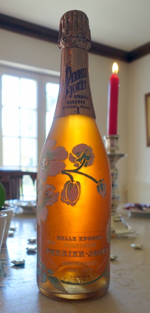 Déjeuner du dimanche en famille avec mon fils de passage, ma fille cadette et ses deux enfants. Pour l’apéritif, il y aura des saucissons dont un de poulet au goût assez curieux, de l’andouille et une rillette. J’ai choisi un Champagne Perrier-Jouët Belle Epoque rosé 1979. La bouteille est très jolie et le rose très prononcé met en valeur par transparence les grosses fleurs blanches du motif Belle Epoque. Le bouchon me résiste. Je donne la bouteille à mon fils qui n’arrive pas non plus à l’ouvrir. Avec un casse-noix ce qui devait arriver arrive, le haut du bouchon se cisaille et il reste le bas du bouchon dans le goulot. J’arrive à piquer le tirebouchon et je relève le bas du bouchon de piètre qualité puisque quelques morceaux tombent dans le vin, et il n’y pas la moindre pression et le moindre pschitt. C’est curieux, car le champagne a toute sa bulle et tout son pétillant. La couleur d’un rose intense est très belle, le nez est doux et agréable et en bouche la vivacité contraste avec l’absence de pression à l’ouverture. Disons-le tout net, c’est un magnifique rosé. Il est vif, et qualité suprême pour un rosé, il est champagne. Je reproche souvent à des rosés de n’être plus champagne. Celui-ci l’est et de belle personnalité. Seule la rillette compose avec lui car les saucissons et l’andouille sont trop forts pour ce breuvage délicat.