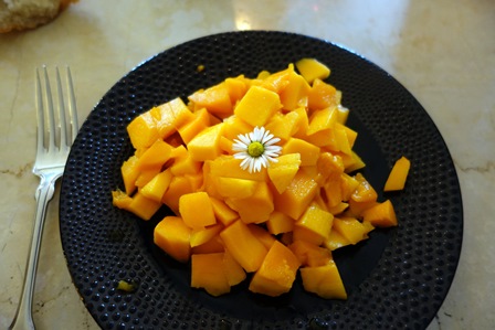 Sur des dés de mangue, le champagne se montre brillant. Perrier-Jouët a fait en 1979 un très grand rosé.