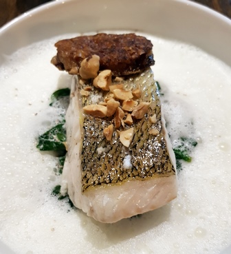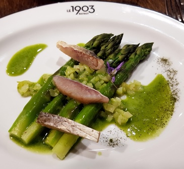 Il faut donc que je dîne – j’ai un rang à tenir – et je choisis les asperges vertes accompagnées de fines tranches de féra puis un sandre flanqué d’un pied de cochon dans une union que l’on verrait dans la peinture de Breughel l’Ancien. Je suis à l’eau et mes amis ont pris au verre une Roussette de Savoie de 2016. Trempant mes lèvres, je ne peux me faire à l’invraisemblable jeunesse de ce vin, trop brut de forge.