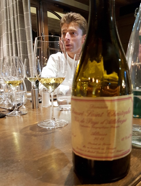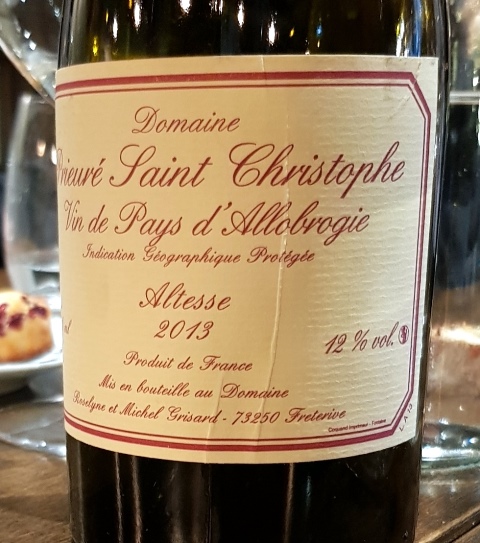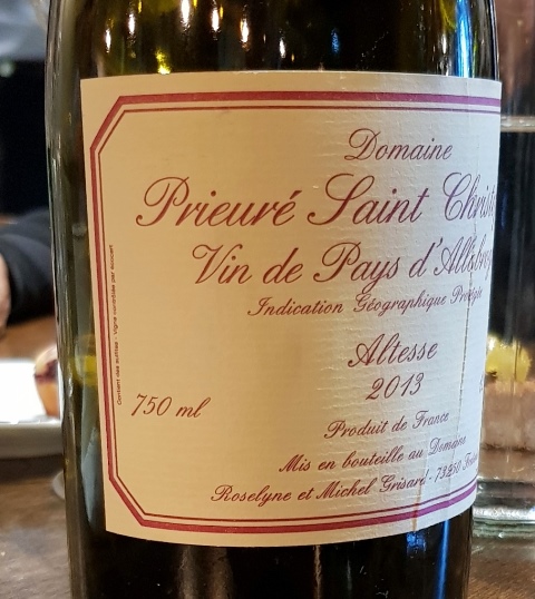Jean Sulpice a manifestement l’envie de nous faire plaisir en son bistrot. Il fait venir un vin que l’on boira à l’aveugle. Je reconnais une Roussette mais je me trompe sur l’année, croyant le vin beaucoup plus vieux qu’il n’est. Il s’agit d’un Vin de Pays d’Allobrogie Altesse Domaine Prieuré Saint Christophe 2013. Il est extrêmement plaisant, bien typé avec de beaux amers qui m’ont trompé car je lui aurais donné quinze ans de plus.