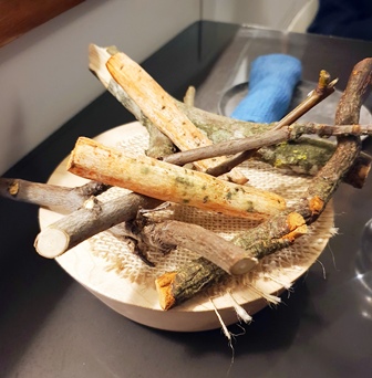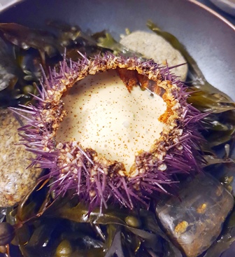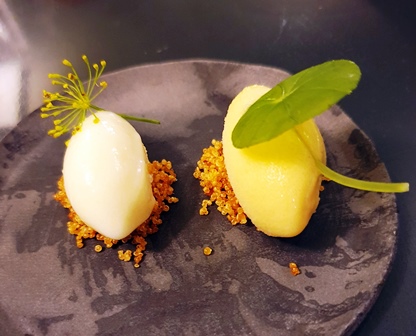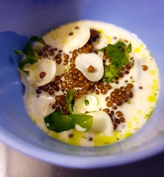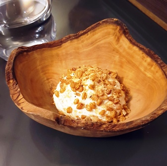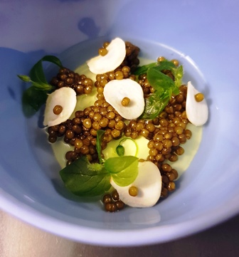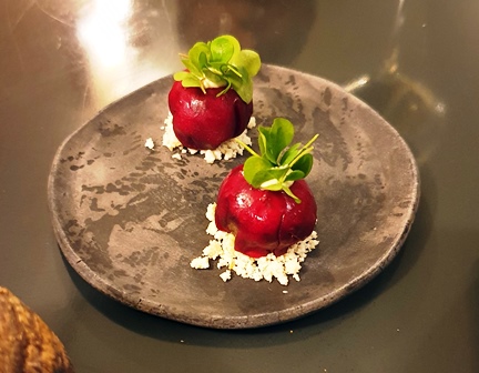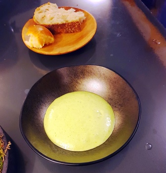 On nous donne le choix entre deux menus, l’un à onze plats et l’autre à huit plats. Le petit menu s’appelle Reine des Prés. Le grand menu s’appelle Lierre Terrestre, pour une raison qui n’apparaîtra pas dans ce que nous mangeons. Mais ce titre est poétique.