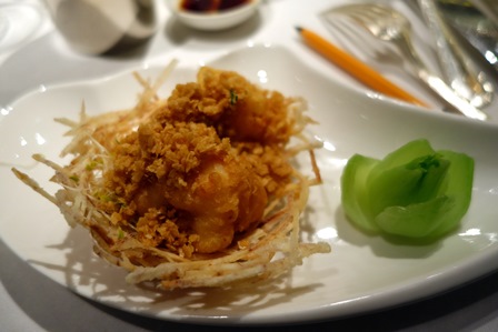 Le dîner dégustation autour des vins de la famille Hugel est ainsi conçu : effiloché de poulet en salade, sauce façon sichuanaise / Ha Kao Siu Mai (qui comprend des beignets de crevette, du crabe et du porc) / ravioli de crabe au bouillon / langouste croustillante aux flocons d’avoine / porc à la sauce aigre-douce / riz sauté à la façon du chef / lait de coco aux céréales, boules moelleuses à la crème montée et fruits frais.