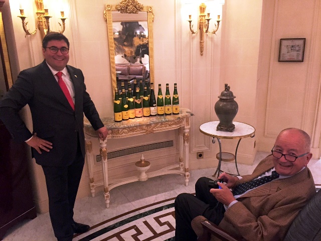 J’arrive vers vingt heures au restaurant chinois de l’hôtel Shangri-La qui a organisé un menu dégustation à six ou huit plats agrémentés de vins de la famille Hugel. Les inscrits ne se mélangent pas et sont répartis à des tables en fonction de leurs réservations. Les représentants de la famille Hugel, Etienne, son fils et son neveu, passeront de table en table pour commenter tel ou tel vin. Serge Dubs fera de même et j’irai aussi saluer ceux qui se sont inscrits à la suite de mon mail annonçant ce dîner. Avant cela, l’apéritif se prend debout avec le Gentil Hugel 2014 qui confirme mon impression du midi, d’un vin franc, simple, frais et de belle soif.