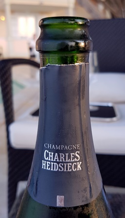 Notre table d’apéritif est directement à l’aplomb de la petite piscine où de jeunes enfants s’ébattent et l’un des serveurs balaie consciencieusement les éclaboussures. La carte des champagnes est vaste et comporte beaucoup de champagnes du groupe Moët Hennessy puisque la Pinède appartient au groupe LVMH de Bernard Arnault. Mais la tarification des champagnes du groupe est un « tue-l’ amour », absolument dissuasive. Je demande à Maxime, le compétent sommelier quelle est l’année de dégorgement du champagne Initial de Selosse et il me regarde en souriant, car j’ai posé strictement la même question il y a deux mois lors d’un dîner en ce lieu.