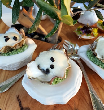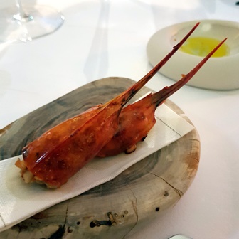 Mon choix se porte sur le Champagne Charles Heidsieck Blanc des Millénaires 1995. C’est un champagne de belle structure, avec une acidité marquée qui va s’estomper dès que le champagne est au contact des jolies présentations à grignoter. Ainsi, dès la délicieuse huître le champagne s’épanouit, vif et vivant. S’il a beaucoup de points communs avec le champagne Salon 1999 que nous avons bu récemment, il lui manque ce petit supplément d’âme qui fait le très grand champagne. Ayant le souvenir encore vivant du sublime Blanc des Millénaires 1985, je range ce 1995 après lui. Il sera cependant un très agréable compagnon de la moitié du repas qui lui est réservée. Après l’huître joliment travaillée nous goûtons des préparations d’olives très agréables, une feuille préparée comme en tempura et d’une grande délicatesse, une crème complexe à base de tomate et une magistrale préparation à base d’escargot qui pourrait aussi cohabiter avec un vin rouge.