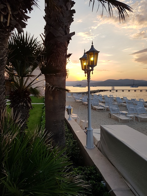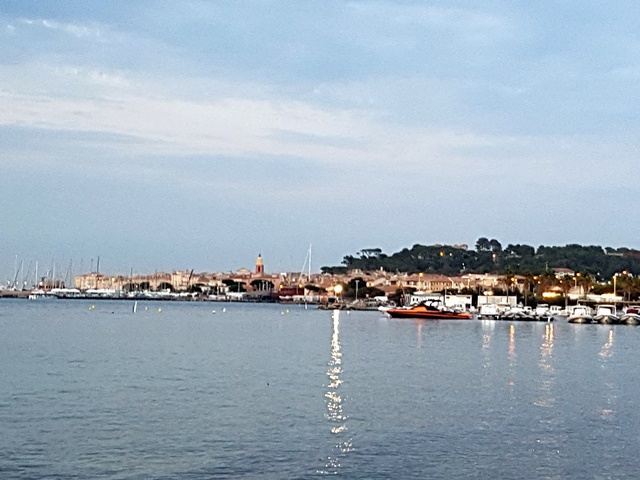 Nous nous rendons avec Sarah au restaurant La Vague d’Or sis dans la Résidence La Pinède qui lui sert d’écrin. Nous arrivons assez tôt sous la lumière du jour pour voir la baie de Saint-Tropez envahie de bateaux plus grands les uns que les autres. On imagine tous les pays où sont immatriculés ces bateaux pour des raisons qui n’ont rien à voir avec la géographie. Pendant l’apéritif, le coucher de soleil derrière les collines offrira des couleurs roses intenses splendides.