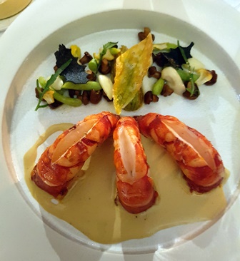 Les gambas traitées par le chef Arnaud Donckele sont d’une chair goûteuse d’un raffinement que je n’ai jamais connu de ce crustacé. Lorsque je rendrai visite au chef en fin de repas dans sa cuisine nous aurons une discussion sur un point de détail. Pour mon goût le velouté froid empêche la chair de la gambas de s’exprimer dans toute sa pureté, alors que pour Arnaud il est inconcevable de faire un plat sans sauce. Arnaud est l’homme des sauces. S’il est l’homme des sauces il est aussi celui des farces, car la farce de gambas que l’on mange dans la coquille de la tête est une merveille. Le plat en deux services est gourmand et raffiné et le champagne Blanc des Millénaires l’accompagne bien avec une belle longueur et un léger manque de largeur mais que l’on oublie volontiers. Les accompagnements de champignons et fleurs sont d’un raffinement absolu.