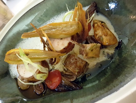Nous ne prendrons pas de menu dégustation et nous orientons l’excellent directeur Thierry di Tullio vers des plats pour le champagne puis pour un vin rouge. Thierry qui ne peut renier ses racines italiennes est un poète lorsqu’il nous décrit les plats. On les mange rien qu’en écoutant ses énoncés. Sarah et moi prenons les mêmes plats, ma femme prenant d’autres orientations puisqu’elle ne boit pas.