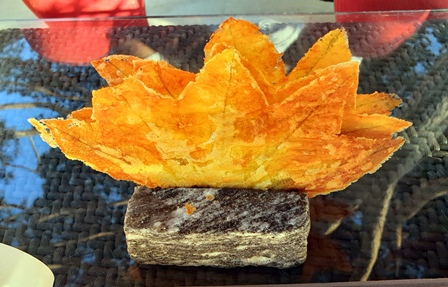 Les amuse-bouches d’apéritif combinent dextérité et sensibilité. Ils sont présentés sous une branche d’olivier. J’aime bien la sérénité du chef qui n’a rien à prouver et envoie les messages que son cœur inspire.