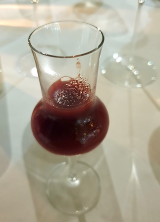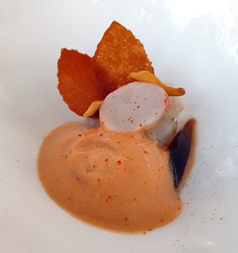 Pour l’apéritif je commande un Champagne Laurent Perrier Grand Siècle qui a été dégorgé en 2017. Au premier contact je le trouve un peu plat, n’ayant pas le côté persuasif que j’aime en ce vin. J’hésite et je pense que je ne vais pas faire un refus pour si peu. Heureusement le champagne s’anime plus sur la nourriture, mais il a un déficit d’émotion qui sera révélé par la juxtaposition avec le brillantissime vin blanc.