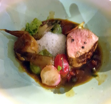 Nous passons à table et l’excellent directeur Thierry di Tullio nous aide à composer notre menu qui sera : les langoustines vivifiées au pamplemousse, broccolettis coupés du matin, basilic citrus et aloe vera au naturel, confection d’un jus d’Hassaku et huile d’olive infusée aux têtes grillées / le turbot cuit en immersion d’eau de mer, citronnelle et algues, poireaux crayon, charlottes et oignons rouges « furio » des terres sableuses de Grimaud, nage d’haliotis de la lagune de Thau / le mignon de veau à la mode Carqueirannaise, les ris au jus et perles de câpres, tomates cœur de pigeon, gnocchis tendres à la sauge florale, quelques dentelles de tête de veau « souvenir de mon enfance ».