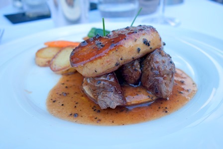 Le quasi de veau est immangeable. Le maître d’hôtel a eu une réaction particulièrement appréciable. Ce plat a été remplacé par un filet de bœuf façon Rossini, pommes de terre rattes à l’ail et aux aromates. Ce plat est excellent mais l’accord eût été plus pertinent avec le veau car la force de la sauce truffée du Rossini écrase le vin.