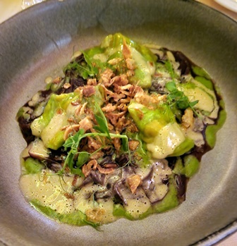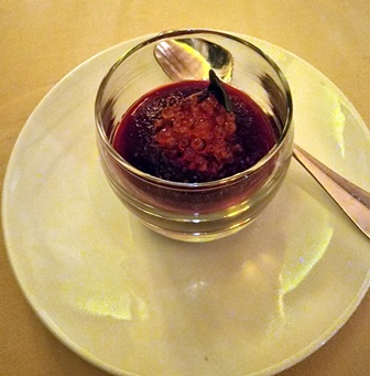 Le vin blanc est beaucoup trop froid, aussi je commande deux coupes de Champagne Veuve Clicquot rosé sans année qui va accompagner l’amuse-bouche, un lit de betteraves, miso et œuf de truite. Le problème de la betterave rouge, c’est qu’elle écrase tout sur son passage, comme Attila roi des Huns. Le champagne est sans histoire.
