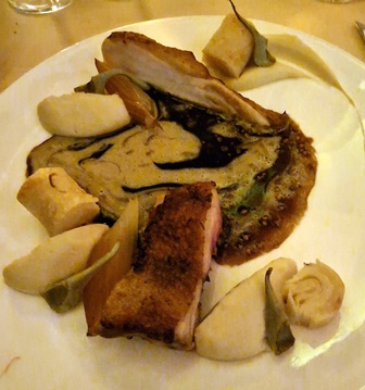 Comme nous buvons lentement ce vin superbe, je commande du foie gras et arrive un pressé de foie gras, chutney de poire au Xérès, fine gelée à l’hibiscus. Bien évidemment je n’ai mangé que le foie gras, sans les ajoutes et j’ai signalé à Hervé Brousse que la cuisine qui a fait des progrès, devrait s’orienter vers des goûts cohérents lorsqu’elle accompagne des vins de si grande qualité.