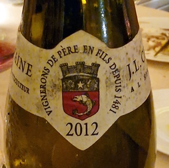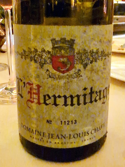 Il est très rare que je dîne seul avec mon fils au restaurant. Ma femme est dans le sud. Nous nous rendons au restaurant L’Écu de France, lieu qui a accueilli beaucoup de réunions familiales dont mon fils a le souvenir. Monsieur Brousse propriétaire des lieux qu’il gère avec sa femme et son fils Hervé, me dit qu’il a trouvé par hasard en cave un Chambolle-Musigny Roumier 2011 qu’il n’avait jamais commandé et a sans doute pris la place d’un 2012. Pourquoi ne pas prendre ce vin ? Pour le blanc, ce sera un Hermitage Chave blanc 2012.