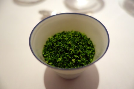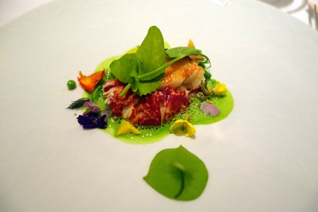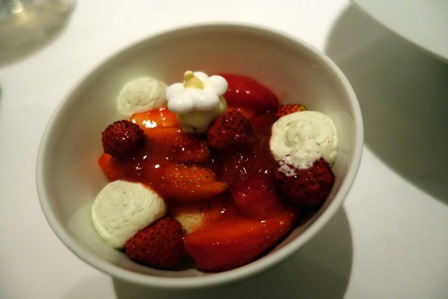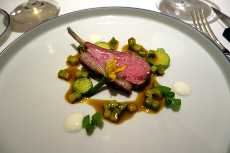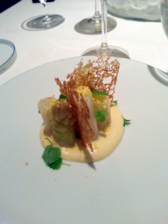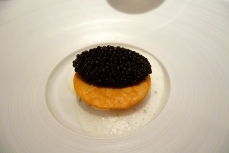 Le menu est imposé et n’offre qu’un ajout possible qui est celui du caviar : brocolis en velouté, mousse et fleur de brocolis / caviar de Sologne, gnocchi, mascarpone et noisettes / langoustines, Combu en crème et gelée, radis croquants / asperges blanches, crème carbonara / turbot, asperges sauvage et sauce aux palourdes / granité pamplemousse et tomate / asperges vertes, ail des ours, œuf mollet et tranche de Cecina de Leon / veau de lait, morilles et sauce au vin jaune, fèves / agneau de Lozère, courgettes et Burrata / citron en crème, panna cotta et sorbet / fraises et glace au laurier / pommes rôties, fraîches et mousse de pomme.