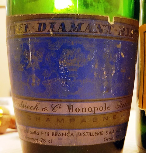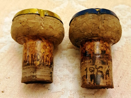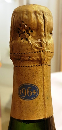 J’ouvre ensuite un Champagne Veuve Clicquot brut sans année qui doit dater du début des années 70 car son bouchon se présente avec le même aspect que celui du Diamant Bleu 1964. Je m’attendais à un témoignage marqué par l’âge mais là aussi, quelle surprise. La bulle est très active et plus grosse que celle du Heidsieck. La couleur est plus claire, joliment jeune et le nez est aussi expressif et de grande pureté, comme pour le 1964. En bouche le vin est plus vif, plus tranchant que le 1964 mais je ne l’attendais pas du tout à ce niveau de noblesse. Bien malin celui qui pourrait lequel est le meilleur. Je trouve la vivacité du Veuve Clicquot très entraînante, avec une belle expression. J’aime la grâce du Diamant Bleu, très Audrey Hepburn. S’il faut choisir, ce sera le Veuve Clicquot brut sans année à cause de son extrêmement vive jeunesse.