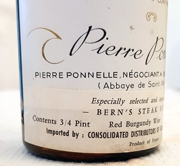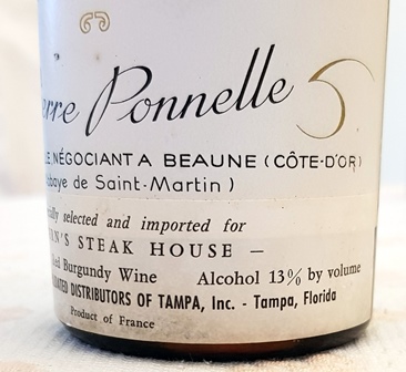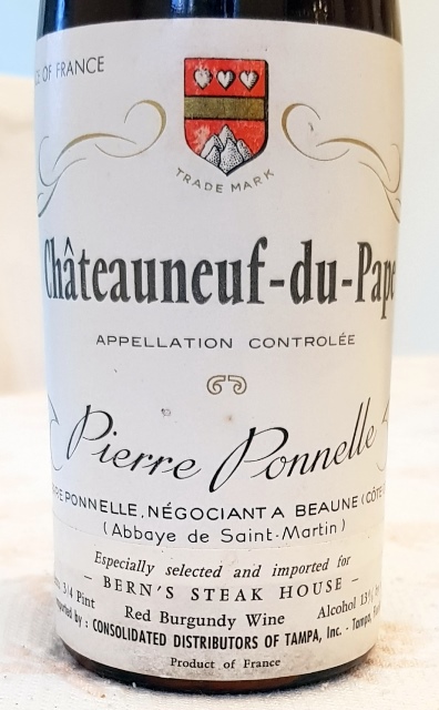 J’ai ouvert un vin qui a une belle valeur sentimentale parce qu’il m’a été offert par Brad Dixon le célèbre sommelier du Bern’s Steak House à Tampa, restaurant où je suis allé chaque fois avec mon fils. Brad me l’a offerte parce que nous avions sympathisé en choisissant ensemble dans sa cave des vins centenaires. Il s’agit d’un Châteauneuf-du-Pape Pierre Ponnelle Négociant à Beaune (Abbaye de Saint-Martin) 1961. Cette demi-bouteille provient de la cave du Bern’s Steak House acquise auprès de l’importateur Consolidated Distributors of Tampa qui a indiqué sur la petite étiquette « Red Burgundy Wine », ce qui est peu à-propos. Le nez du vin est très intense, profond, et racé. Le vin est vif. Mon fils estime qu’il fait son âge mais je trouve que sa vivacité et sa profondeur correspondent à un vin qui est deux fois plus jeune que 1961. Il est riche, rhodanien, bien structuré et d’une longueur que je n’imaginais pas à ce nouveau. C’est un concentré de qualités.