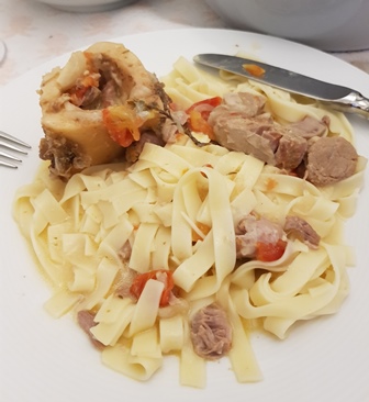 Le soir, c’est le grand moment pour fêter les 273 kilomètres du cross de mon fils. J’ai choisi un champagne que j’adore dans des versions plus âgées, le Champagne Krug Clos du Mesnil 2002. Ça fait drôle d’avoir un pschitt aussi sensible avec un champagne, car il est rare que j’en boive d’aussi jeunes. Le nez est particulièrement intense et minéral. En bouche, il est très vert car il est très jeune, mais la noblesse de ses complexités est remarquable. Le plat est un osso-buco avec des tagliatelles.