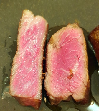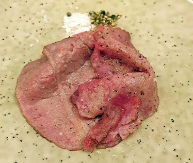 Je fais servir par Matthieu le Kebir-Rosé Frédéric Lung années 40 afin que sur les plats nous puissions choisir le champagne ou le rosé. Le nez du rosé, à l’ouverture, était prometteur. Il est toujours brillant, fort, suggérant la puissance d’un vin très foncé. Le vin conquérant évoque pour moi le café, caractéristique des vins algériens, le cigare et le fumé. Il est évident – instinctivement – qu’il faut le Kebir sur le carpaccio de wagyu. Et l’accord est transcendantal car il y a une continuité de goût absolue entre la viande et le vin. Le Krug est possible mais ne crée pas la même osmose.