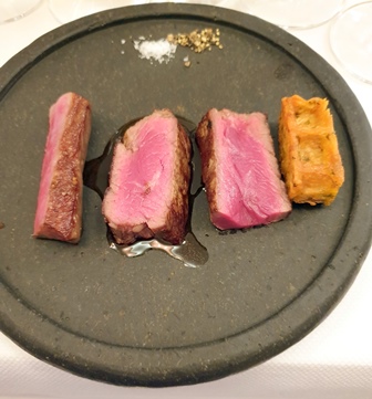 Les deux plats de viande sont parfaits, et l’intermède du toast à la truffe est idéal pour le Vega Sicilia, mais le Krug ainsi que le rosé se complaisent aussi avec la truffe particulièrement odorante. Ce qui est fascinant, c’est que tous les accords se sont montrés brillants et qu’il y a toujours eu un vin qui formait l’accord idéal. J’ai même essayé le wagyu très gras avec le rosé et ça marchait mieux qu’avec le vin espagnol moins à l’aise sur la viande japonaise qu’avec les viandes françaises plus matures.