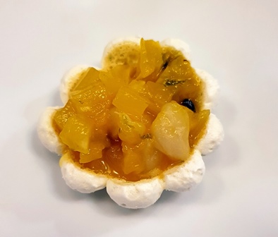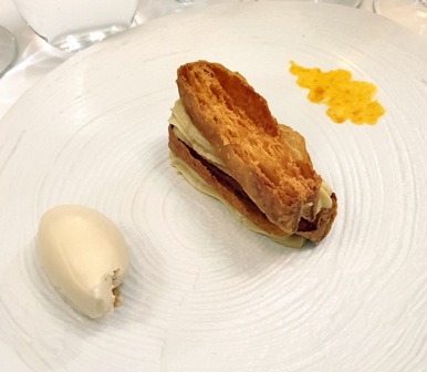 Le premier dessert de Yuki, la charmante et souriante pâtissière, est un miracle de fraîcheur. Le Château Bernisse Castelnau Sauternes 1961 a une robe claire, un nez discret et subtil et une bouche délicate. C’est un sauternes en suggestion. Il est idéal pour ce premier dessert. A ma grande surprise, il se comporte bien aussi avec le dessert plus riche, un millefeuille au parfum de feuilles de chênes.