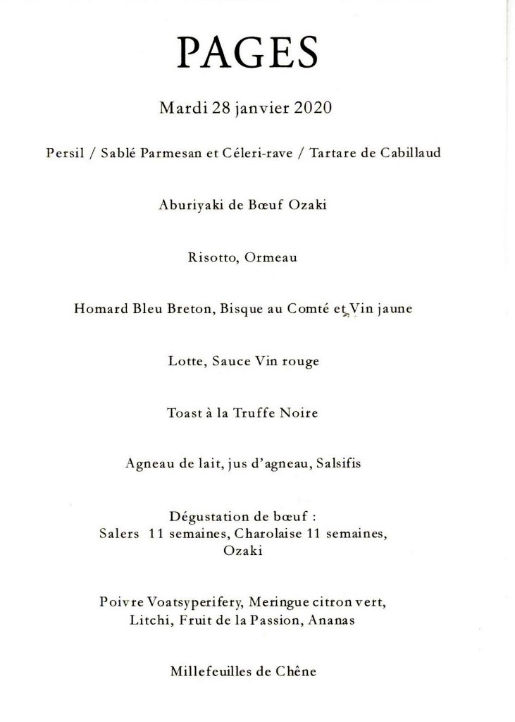 Le menu est ainsi rédigé : persil, sablé parmesan et céleri-rave, tartare de cabillaud / Aburiyaki de bœuf Ozaki / risotto, ormeau / homard bleu breton, bisque au comté et vin jaune / lotte sauce vin rouge / agneau de lait, jus d’agneau, salsifis / toast à la truffe noire / trois bœufs, Salers 11 semaines, Charolaise 11 semaines, wagyu Ozaki / poivre Voatsyperifery, meringue citron vert, litchi, fruit de la passion, ananas / millefeuille de chêne.