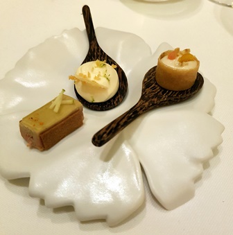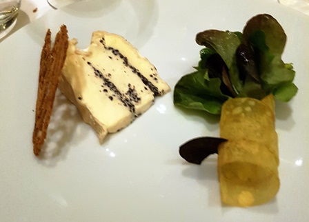 A 19h30 nous nous retrouvons au salon du bar de l’hôtel autour d’un Champagne Legras et Haas Chouilly Grand Cru Blanc de Blancs non millésimé, très agréable, fluide, beau champagne d’une belle soif. Les tuiles au parmesan se marient bien avec ce champagne agréable.