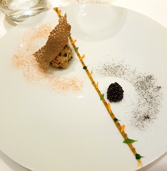 Le menu mis au point par Philippe Mille le chef, Philippe Jamesse, l’excellent sommelier, Jérôme et Pierre, nos deux hôtes, est : tartare de gambas blanches au caviar, pommes céleri et agrumes / homard de casier de Montmartin au parfum d’estragon, lentillons de la Champagne et royale d’oignons doux / entrecôte de veau rôti au beurre demi-sel, pommes fondantes et champignons au palomino / brillat-savarin farci de truffe noire, dentelle de pain croustillante / dans l’esprit d’une tarte à l’orange, granité traditionnel et sablé agrumes.