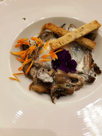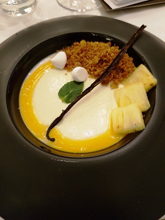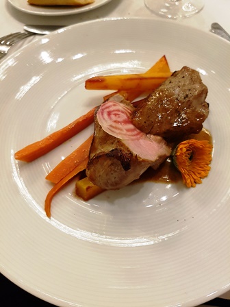 Le menu du repas est : œuf parfait, fricassée de champignons, émulsion de parmesan / quasi de veau, jus court, légumes acidulés / Panacotta aux fruits de la passion. Le repas m’a agréablement surpris par sa qualité. Les serveurs proposent un vin blanc ou un vin rouge du même domaine. J’ai pris le vin rouge, Mas de la Tour Languedoc Roussillon 2015. Comme pour le repas j’ai eu une bonne surprise avec ce vin du Pays d’Oc bien équilibré qui ne surjoue pas et se montre très agréable dans sa simplicité.
