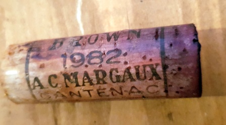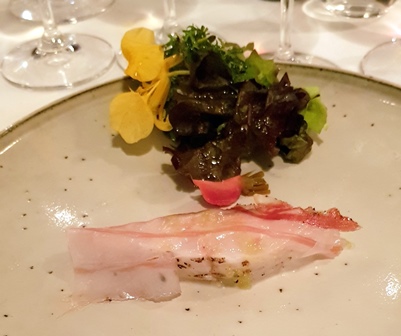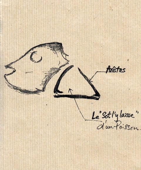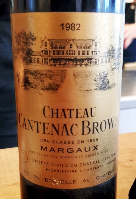 On a remis à chacun un petit dessin sur une feuille de papier d’emballage, naïf comme un dessin d’enfant, qui explique où se trouve le sot-l’y-laisse d’un poisson qui nous est servi maintenant. J’ai l’intuition que le poisson va s’accorder avec le Château Cantenac-Brown 1982 de mon ami. A l’ouverture, son nez était assez incertain et plat, mais le vin se révèle sur le poisson, offrant un joli velours et une agréable personnalité, créant un bel accord. Le poisson est traité avec une justesse remarquable, les fines herbes étant d’une rare intelligence.