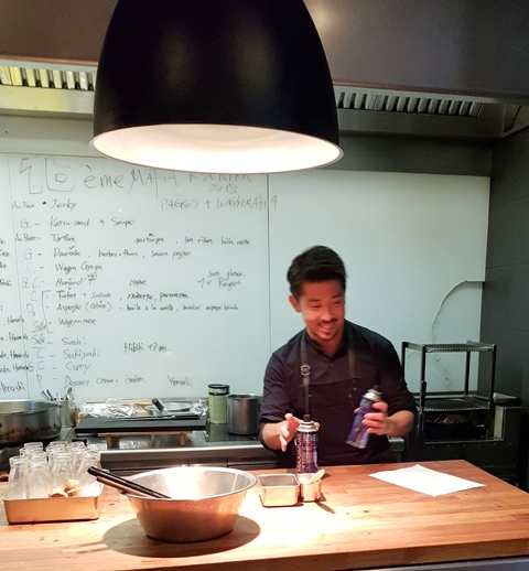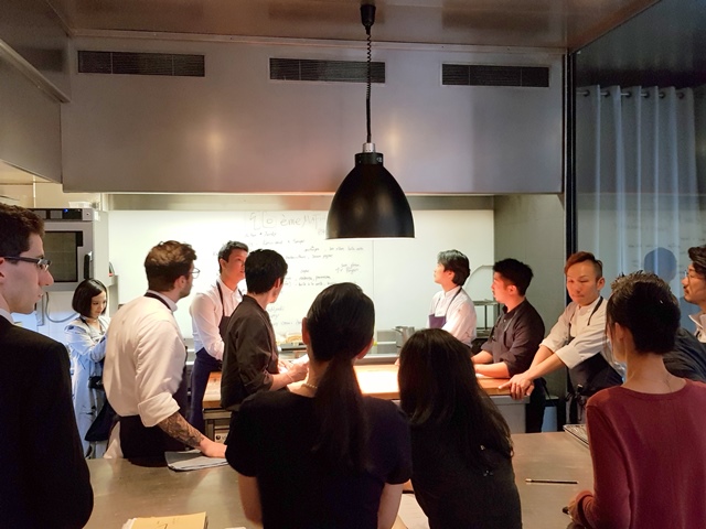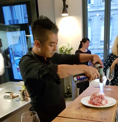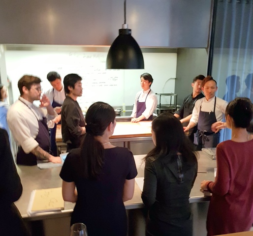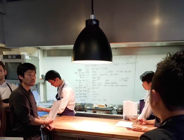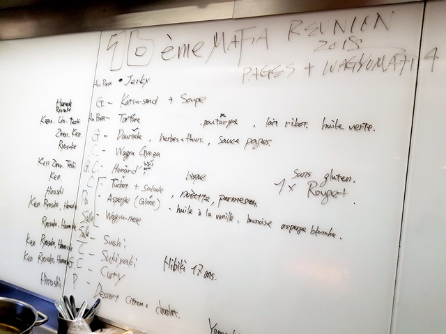 Etant en avance je vois dans la cuisine s’affairer les deux équipes, celle du restaurant Pages et celle de la Wagyu Mafia dirigée par Hisato Hamada, le patron de ce groupe. A un moment donné tout s’arrête et le programme du dîner ayant été inscrit sur un tableau, le chef Ryuji Teshima dit Teshi et Hisato Hamada commentent et donnent les instructions de service et de finition des plats.