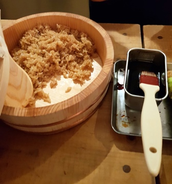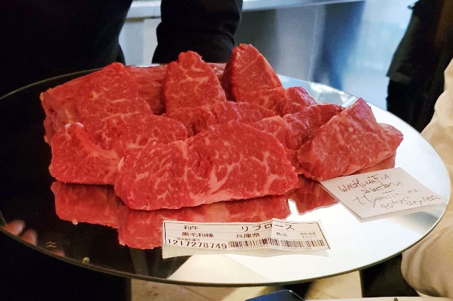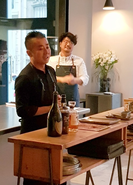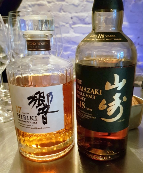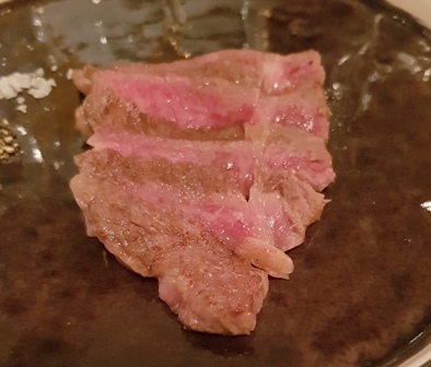 En cours de repas, sur certains plats et curieusement pas sur le wagyu comme je l’aurais imaginé, on nous a donné à goûter deux whiskies. Le Hibiki 17 ans d’âge Suntori whisky et le Yamazaki Single Malt Whisky 18 ans d’âge lui aussi du groupe Suntori, que j’avais goûté lors du dernier déjeuner. J’ai donc pu, grâce à l’ajoute dont j’ai bénéficié, goûter le mariage wagyu bien gras et whisky, mariage très naturel.