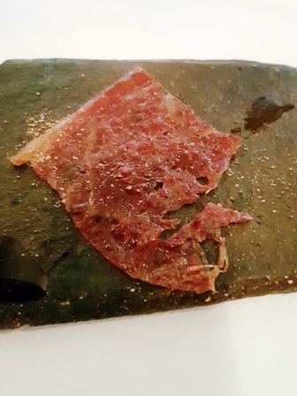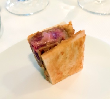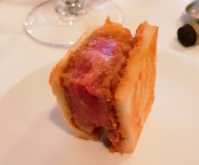 Lorsque Hisato Hamada se présente et présente le sandwich au bœuf de 11 ans, je n’aime pas trop qu’il parle d’argent en disant que c’est le sandwich le plus cher au monde. Le bœuf est absolument délicieux mais comme on nous demande de manger le sandwich en le tenant dans sa main, sans se servir de couverts, je le regrette, car on le mange presque en une bouchée alors que j’aurais aimé prolonger le plaisir tant cette viande est passionnante, en la découpant en petits morceaux.