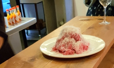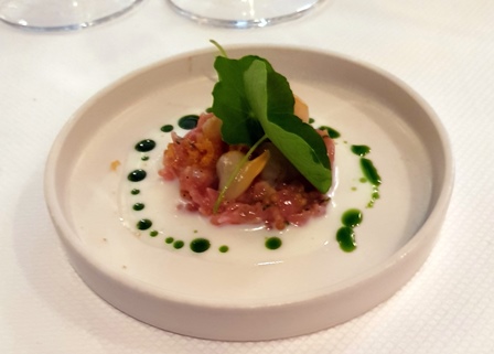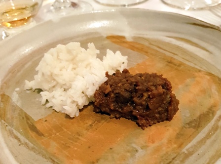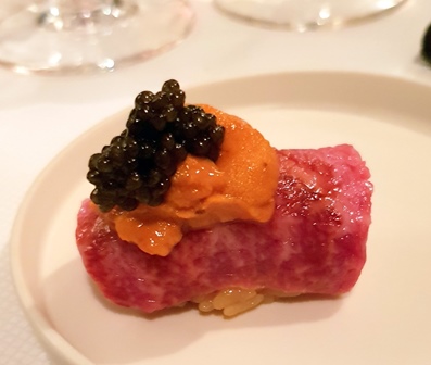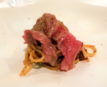 Nous avons eu une sorte de ravioli de wagyu avec une sauce extrêmement pimentée sur laquelle seul le Vega Sicilia Unico 1989, que j’avais choisi de la même année que le Krug, est capable de résister. Ce vin avait à l’ouverture un parfum d’une invraisemblable séduction avec des notes fraîches de menthe, de fenouil et d’eucalyptus. On retrouve ces évocations en bouche, et le vin se montre brillant, gourmand, fou de joie et de charme, avec une fraîcheur qui est son arme fatale. Il va accompagner les autres présentations de wagyu dont beaucoup sont surprenantes. Ainsi, du wagyu est servi avec des spaghettis, un autre est recouvert d’oursin et de caviar et repose sur du riz.