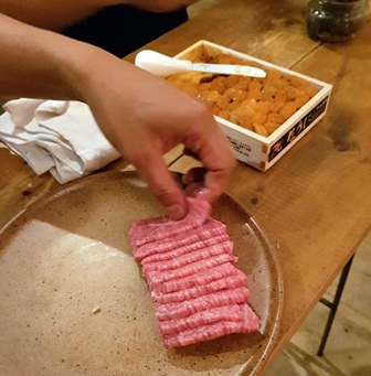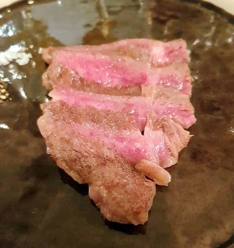 On nous a servi ensuite du turbot mariné recouvert de ventrèche de porc, puis nous sommes passés au dessert. Je m’attendais à ce que nous profitions à un moment ou à un autre du wagyu seul, sans accompagnement, pour jouir de son gras sans être détourné par d’autres saveurs. Et ça me manquait au point de dire à Teshi que j’aimerais bien une tranche de wagyu dans sa pureté. Je ne remercierai jamais assez Teshi d’avoir répondu si gentiment à ma requête.