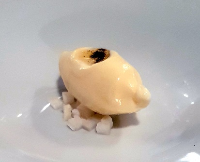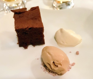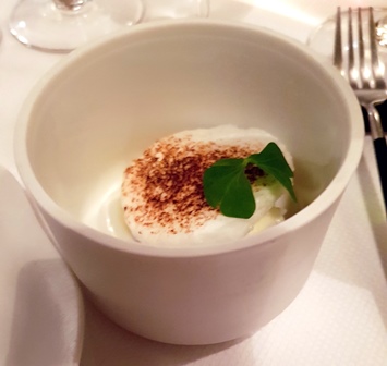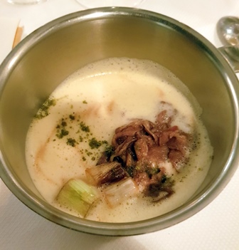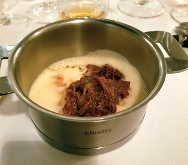 Il n’en est pas de même du homard qui ne m’a pas convaincu. On a en effet trop de choses disparates : une pince plutôt mal cuite, le corps du homard en tempura, le caviar, le tapioca et une bisque forte. Tout cela n’a pas une cohérence suffisante. Nous avons essayé le deuxième vin de mon ami, un vin italien San Francesco Gattinara domaine Antoniolo 2009 vin du Piémont qui titre 14°. C’est un vin simple, sans histoire, neutre sur le homard qui préfère le Krug et qu’ensuite le Wagyu a mis en valeur.