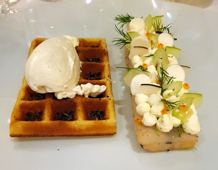 Sur la truite nous buvons le Riesling Sharzhofberger Kabinett Egon Müller 2015. Michel Bettane nous avait dit que la caractéristique de la Sarre est de faire des vins salins. Celui-ci en est une preuve manifeste. Il allie le sel et une belle acidité et n’existe qu’avec le plat absolument réussi avec des équilibres de saveurs géniaux, car seul, il a la jeunesse assez rude. La truite est magistrale et la gaufre la complète très bien par un croquant délicat. C’est le meilleur accord du repas.