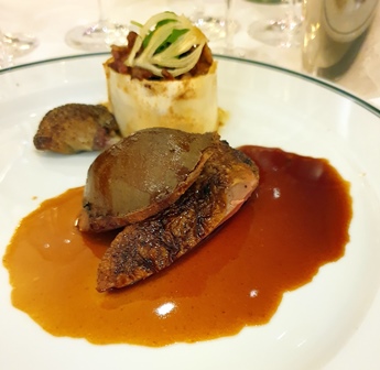 Il y avait beaucoup plus de vins que ce que j’ai goûté. Nous redescendons pour l’apéritif avec un Champagne Louis Roederer Brut sans année bien mis en valeur par les succulents canapés dont un au pied de porc et un autre à l’anguille. Le président Alain Graillot prend la parole pour remettre le prix Alain Senderens à Christine et Guillaume Viala du restaurant le Belvédère à Bozouls dans l’Aveyron. Nous sommes nombreux à ne pas connaître ce restaurant et à avoir envie d’y aller.