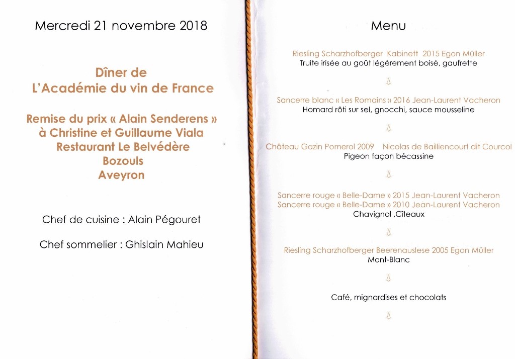 L’Académie du Vin de France tient son assemblée annuelle au restaurant Laurent. A 18 heures les membres de l’académie sont en assemblée. A 19 heures se tient une sorte de Paulée où les vignerons font goûter aux académiciens et à leurs invités leurs derniers vins mis en bouteille et à 20h30 se tient le dîner de gala. Arrivé en avance, je vois un couple de jeunes personnes qui attendent, un peu effarouchés et dont le dress code n’est pas usuel pour le dîner de gala de l’académie. Ils ont l’air sympathique alors je bavarde avec eux. J’apprends qu’ils vont recevoir le prix Alain Senderens qui couronne un restaurant pour qui les accords mets et vins sont primordiaux. Il s’agit de Christine et Guillaume Viala qui sont restaurateurs à Bozouls dans l’Aveyron, et dont le restaurant s’appelle le Belvédère.