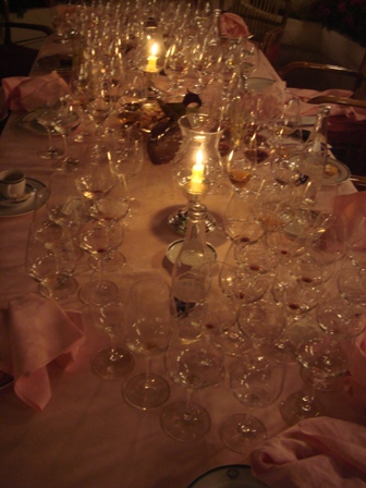 J’arrive un peu avant 17 heures et Daniel, jeune sommelier qui nous servira ce soir avec beaucoup de sens de l’à-propos m’a aidé, sous la supervision amicale de Patrick Lair. Les bouchons s’extraient avec une rare facilité. Les odeurs sont authentiques, saines. La seule qui me fait un peu peur, c’est celle du Laville Haut-Brion, dont la fatigue est certaine. Il y a une chose dont Yquem pourra faire l’économie. Pour vanter de grands parfums, on fait des ponts d’or à Sharon Stone, Charlize Théron ou Monica Bellucci. Yquem n’a pas besoin de cette aide là. Le parfum de l’Yquem 1955 est un danger mortel. On perd son âme devant cette séduction. L’odeur du Tokay m’évoque tellement le litchi que je voudrais qu’on en trouve. Cela eût pris trop de temps, et le foie gras prévu sera encore meilleur.