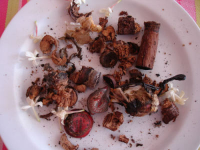 sur cette assiette d’un dîner antérieur, j’ai jeté quelques parcelles de fleurs…