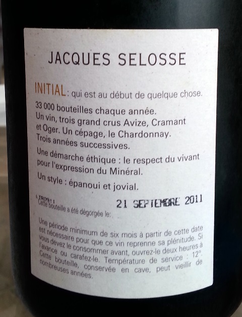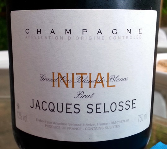C’est le premier dîner d’été où nous invitons. Des voisins et amis nous rejoignent. L’apéritif permet d’ouvrir un Champagne Initial de Jacques Selosse dégorgé en septembre 2011. La première impression est que ce délai de quatre ans après dégorgement est un idéal. Car le champagne est d’une sérénité remarquable. Sa couleur est d’un jaune un peu foncé, de blés de fin d’été, la bulle est bien active et en bouche le champagne est rond, plein, joyeux, facile à vivre, avec un peu de fruits jaunes et des suggestions de miel. Avec ce champagne on ne se pose pas de question, on le boit en se disant que c’est sacrément bon. Des toasts avec des miettes de maquereaux et des toasts avec du foie gras coiffé de kumquats confits cohabitent très bien avec le champagne qui les accueille à bras ouverts tant il est à l’aise. A table, un œuf juste poché sur un fond de purée de petits pois oblige le champagne à devenir plus sophistiqué et il le réussit.