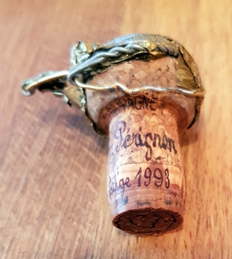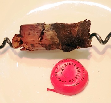 Dans ma cave, la seconde bouteille m’avait fait de l’œil et je lui avais fait confiance malgré un niveau entre basse et mi- épaule. Dans le décor du restaurant sombre car les lumières ne sont pas toutes allumées, la bouteille me sourit moins. Je décapsule La Fleur-Pétrus Pomerol 1945 et je vois que le bouchon est légèrement descendu dans le goulot, de 6 millimètres peut-être. Si je veux piquer le tirebouchon, je pense que le bouchon va glisser vers le bas, car le haut du bouchon est comme vitrifié ce qui rend le pointage de la mèche extrêmement difficile. Commence alors une chirurgie délicate car je ne peux quasiment rien retirer sans déchirer le bouchon en mille morceaux. La raison en est que le haut du goulot est plus étroit que le goulot. J’émiette tout et je suis même obligé d’aller à la pêche aux quelques morceaux qui sont tombés dans le liquide. Je sens le vin est c’est assez repoussant. Il y a une odeur assez acide et de serpillière qui en rebuterait plus d’un. Etant habitué à ces odeurs, j’espère que tout se passera bien. Ma seule crainte est que le goût ne soit un peu torréfié car les autres mauvaises odeurs ont toutes les chances de disparaître. J’ai apporté avec moi un vin de secours de Bourgogne d’une année qu’aime Tomo, plus une demi-bouteille d’un jeune Yquem et enfin une surprise que je veux faire à Tomo.